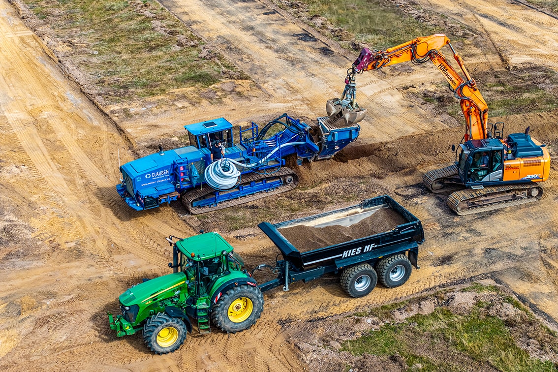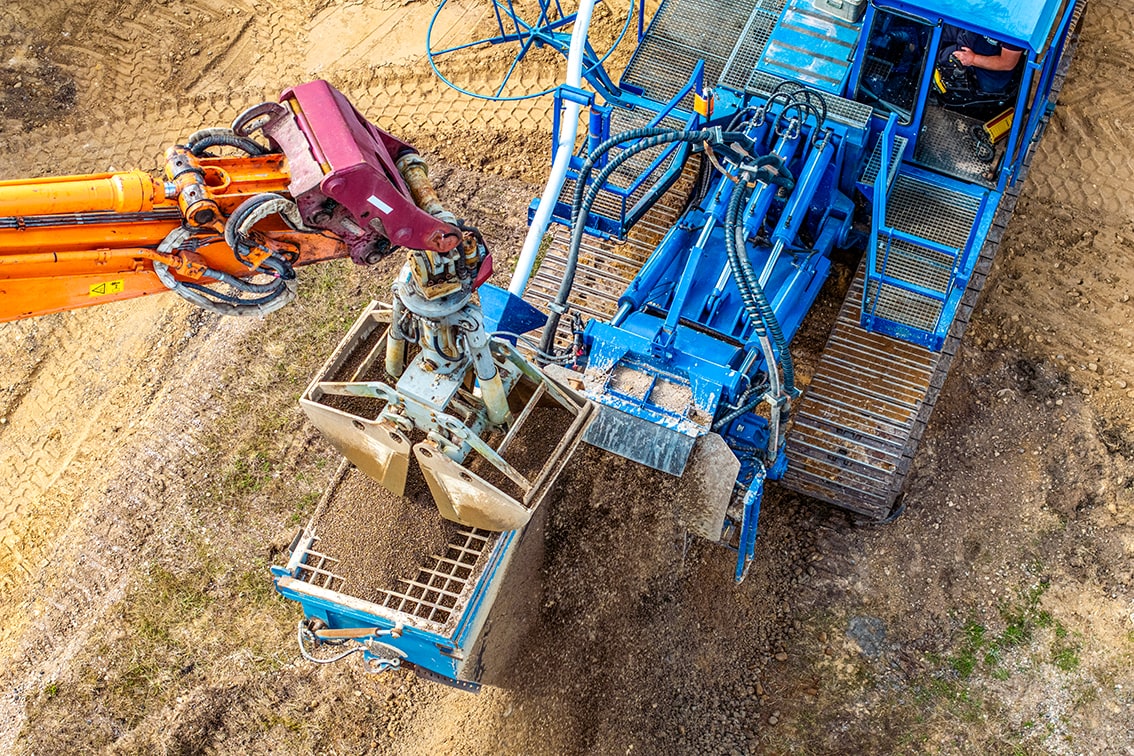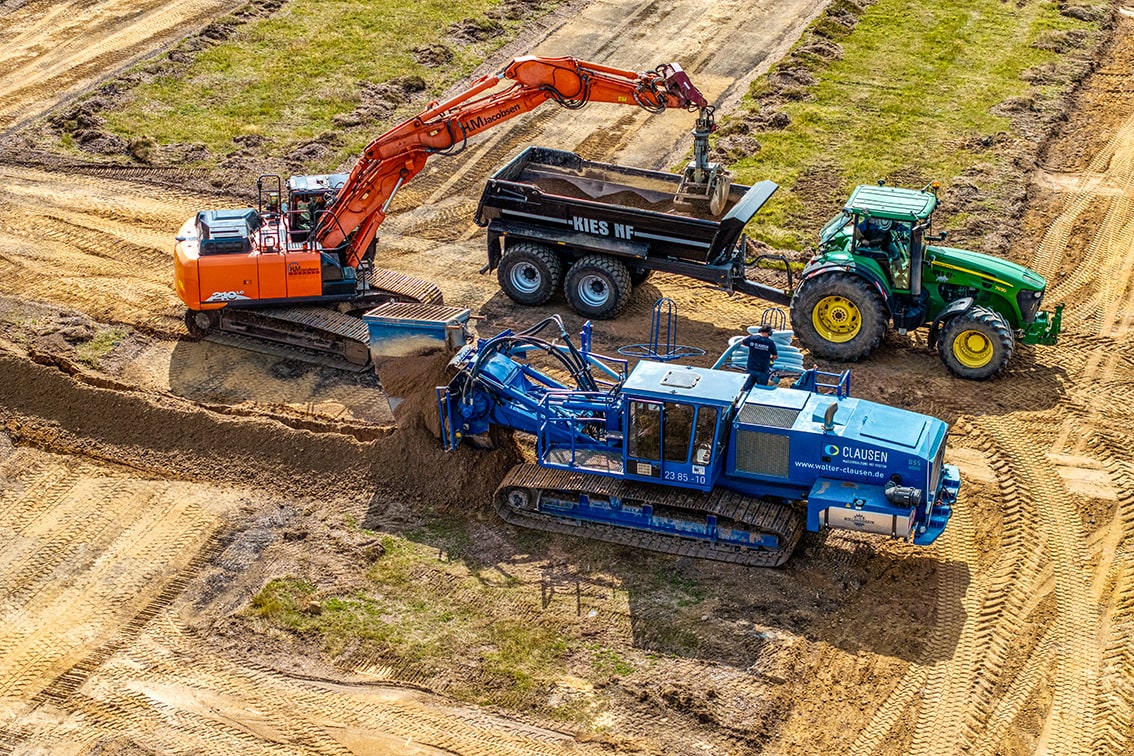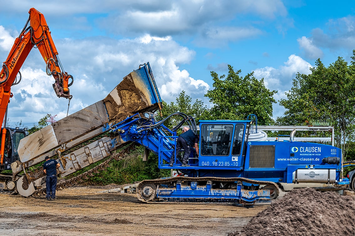Um eine ausreichende Trockenlegung zu gewährleisten, können wir Drainagesysteme bis zu einer Tiefe von 6 Metern unter Geländehöhe entwerfen und im Einfräsverfahren anlegen. Die Horizontaldrainage kann im Freigefälle entwässern oder im Vakuumverfahren mittels Kolbenpumpen betrieben werden.